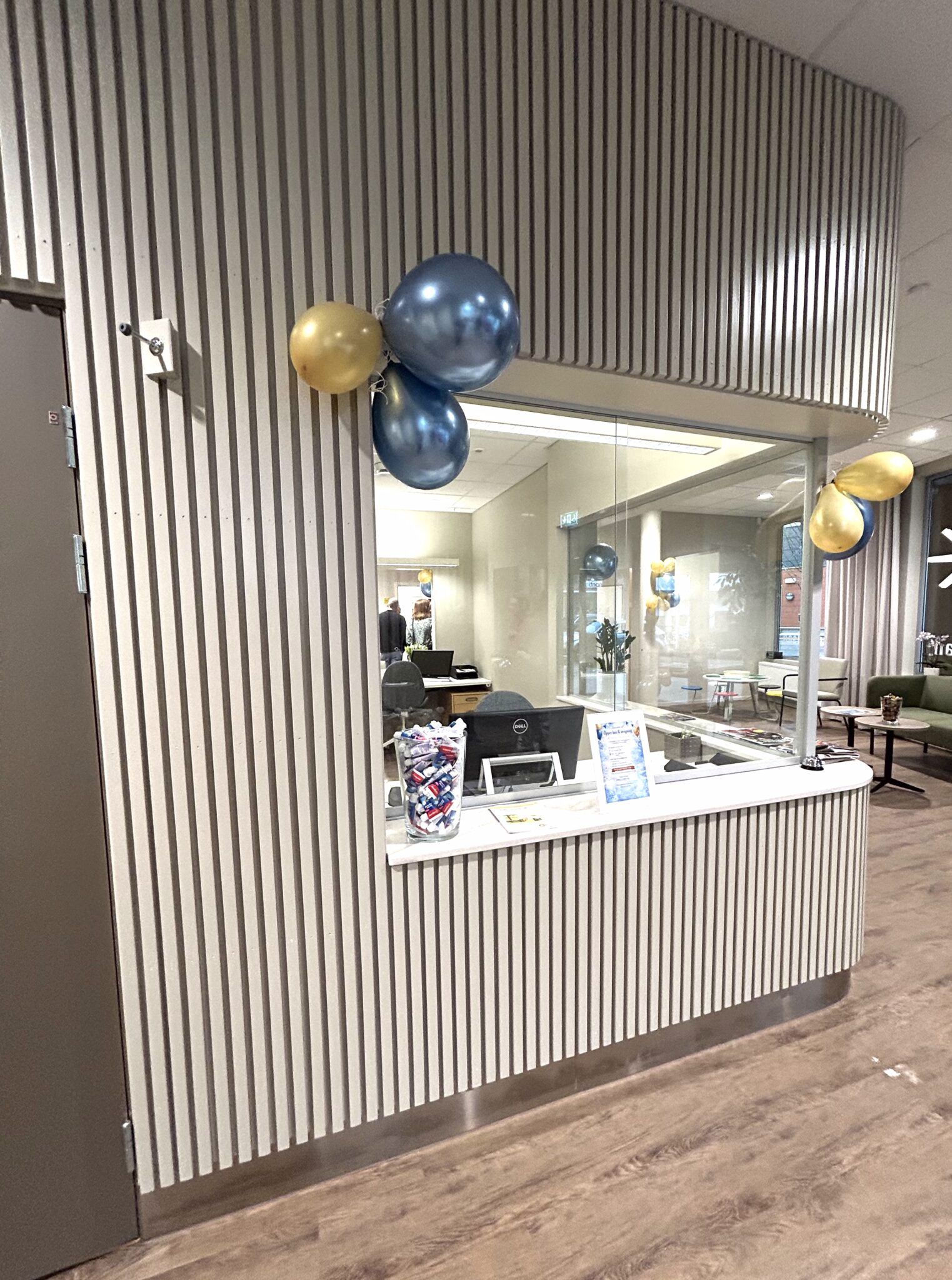 Receptionen har två luckor som servar både yttre och inre väntrum. I anslutning finns ett backoffice där det går att arbeta ostört men ändå ha uppsikt över patienterna.