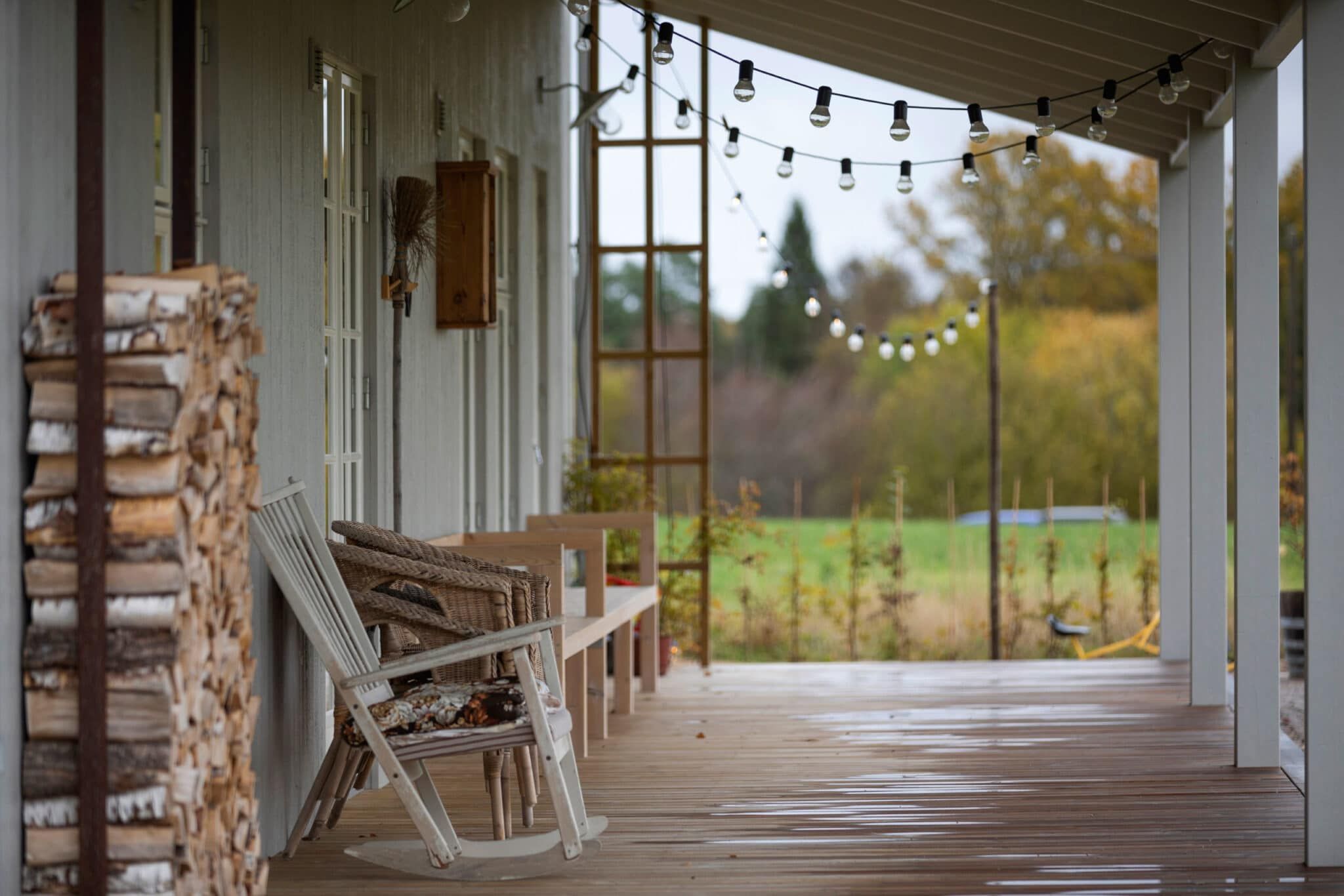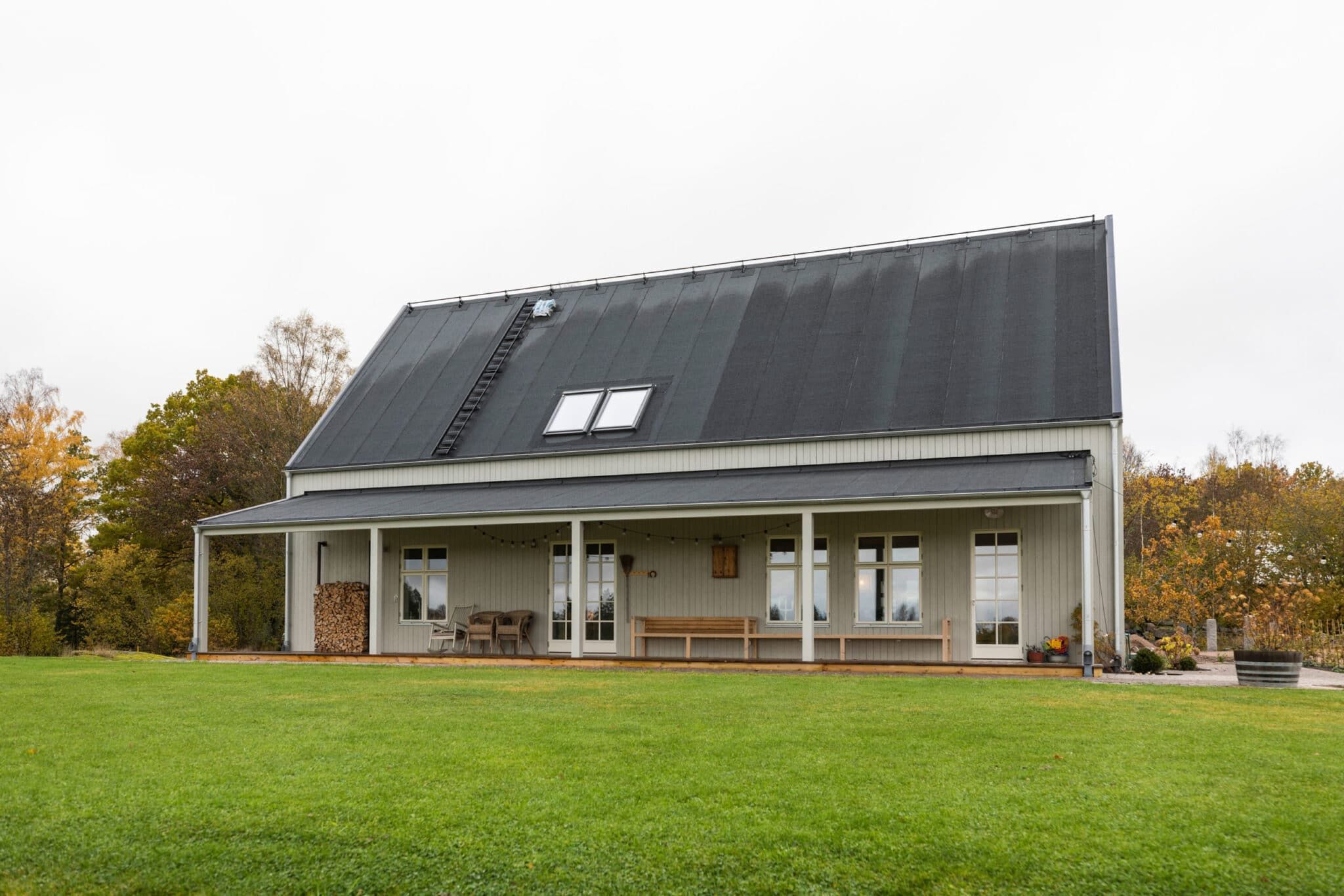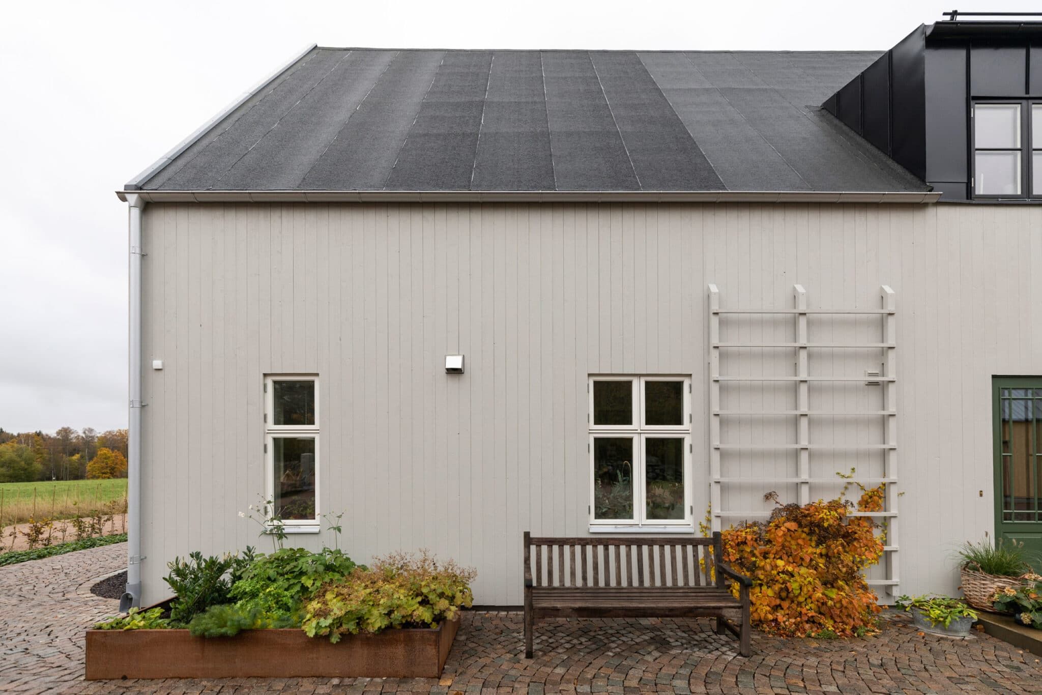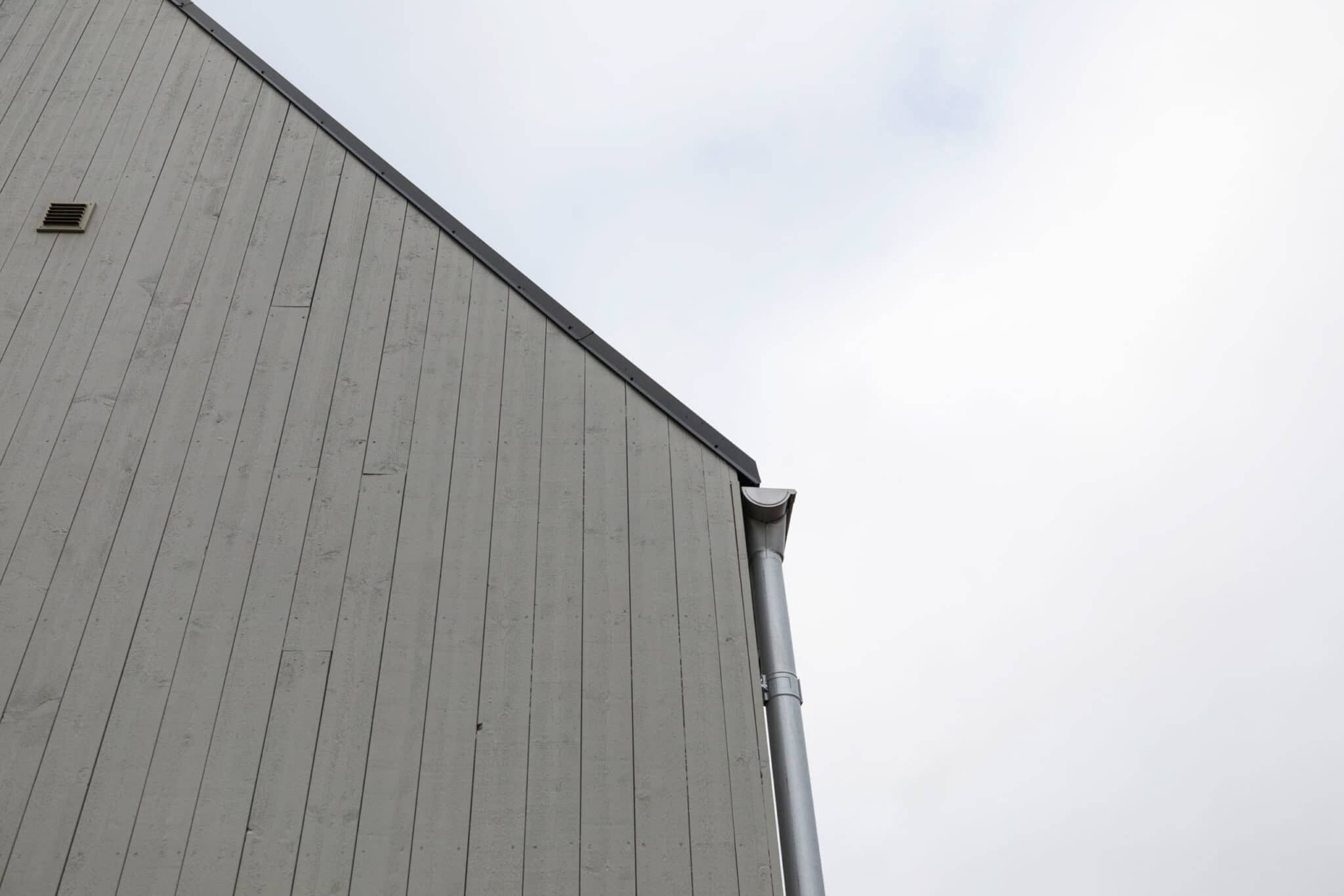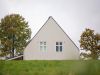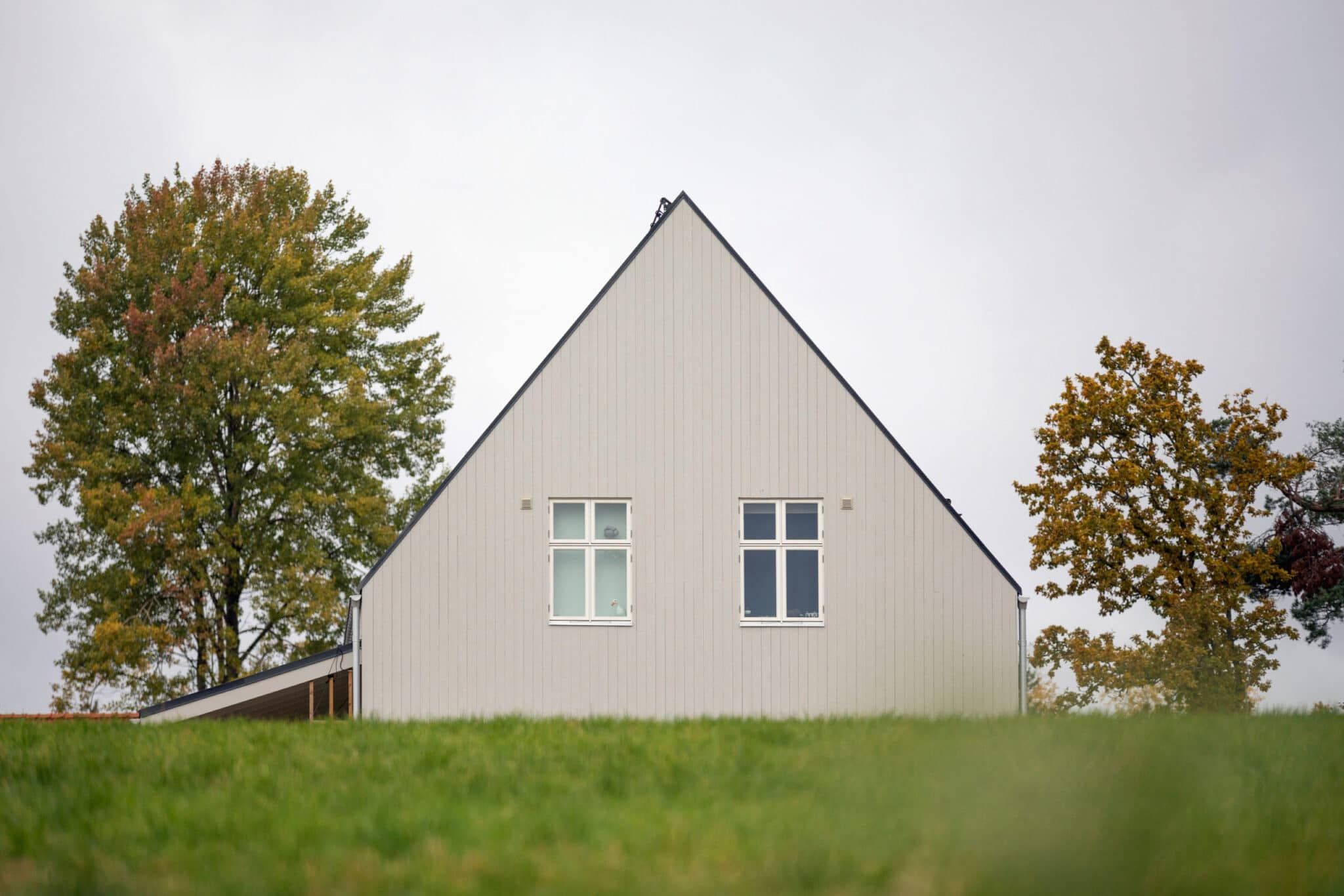 Ett enkelt formspråk med en gavelspets som på ett självklart sätt sticker upp i det gröna landskapet.