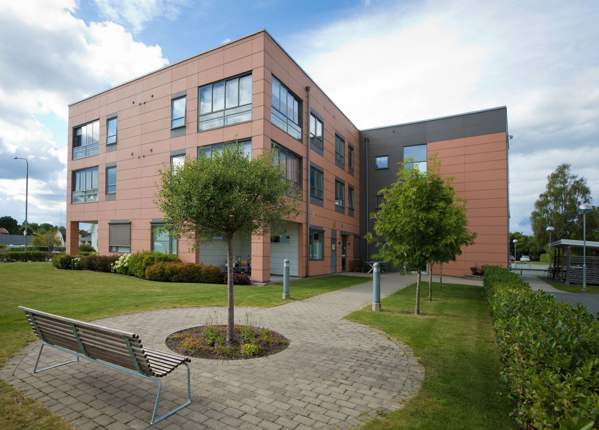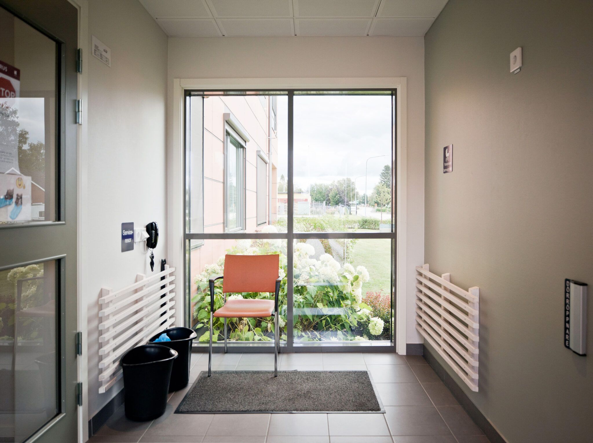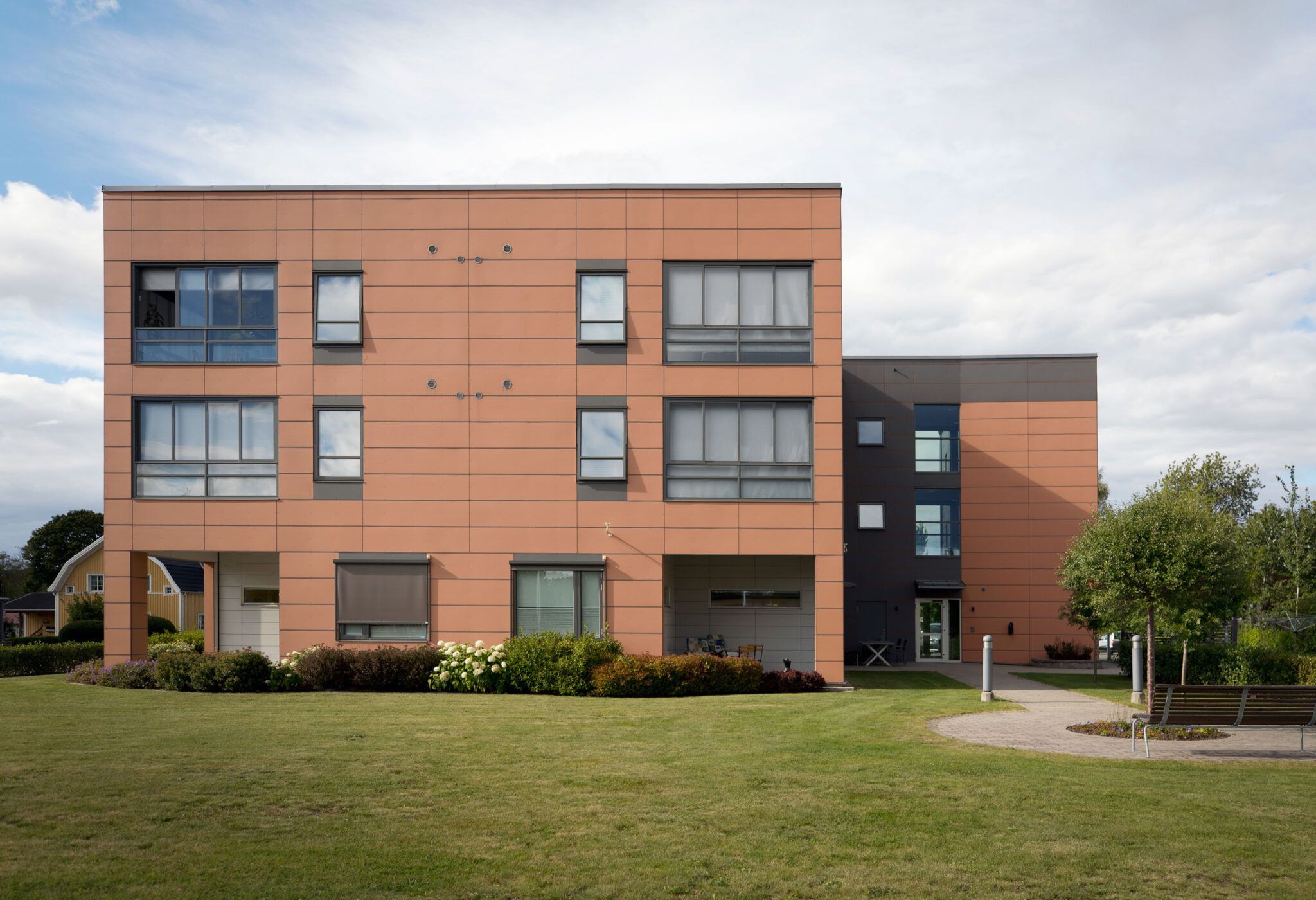 Lägenheternas trapphus med hiss och förråd ligger i en egen huskropp och är separerad från folktandvårdens entré.