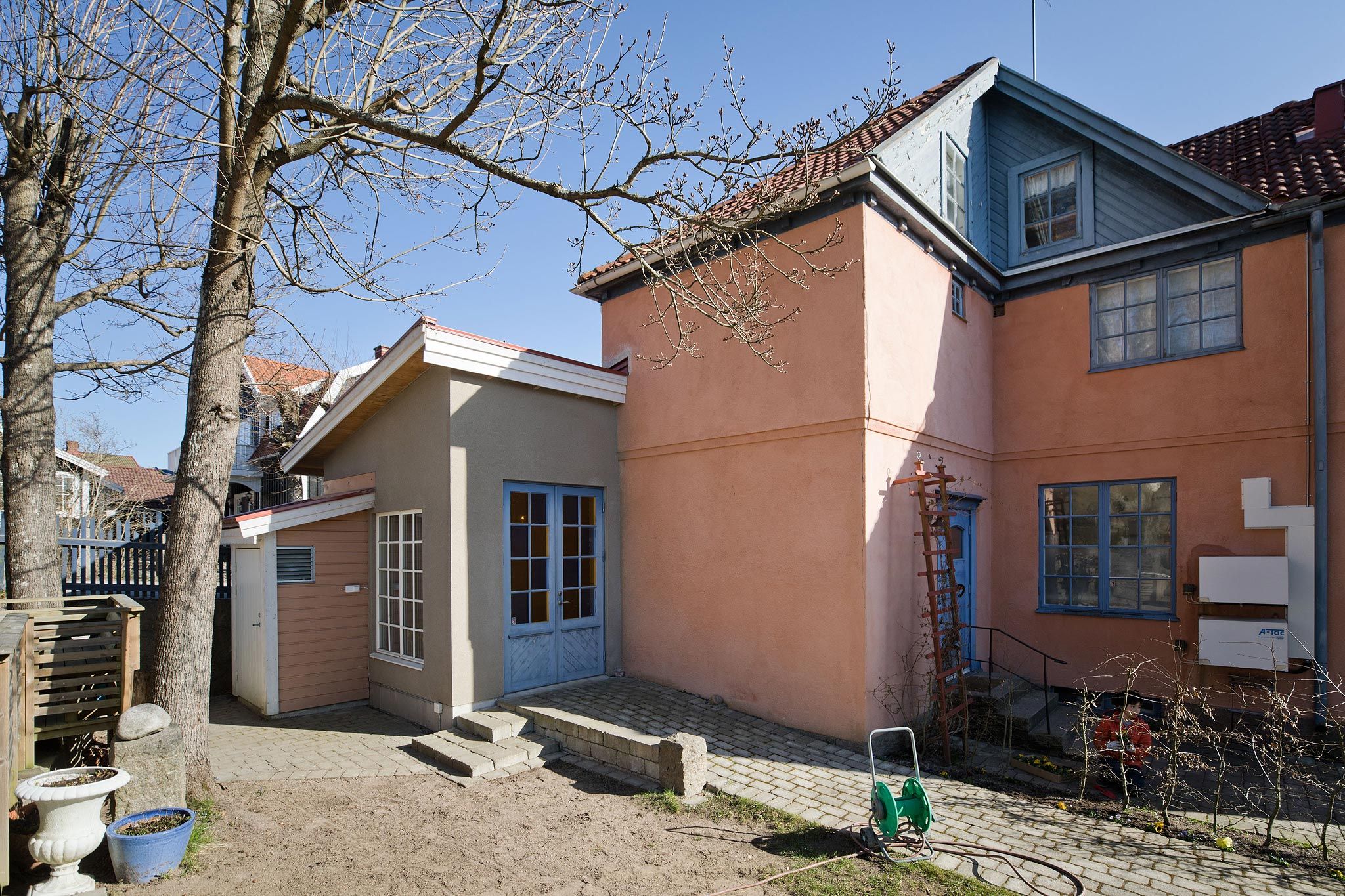Den blåa pardörren som vetter mot gården satt tidigare i den husfasad som har byggts för.